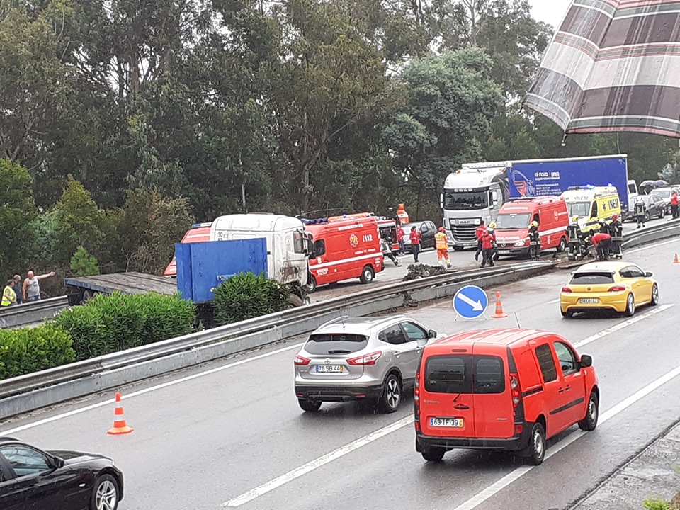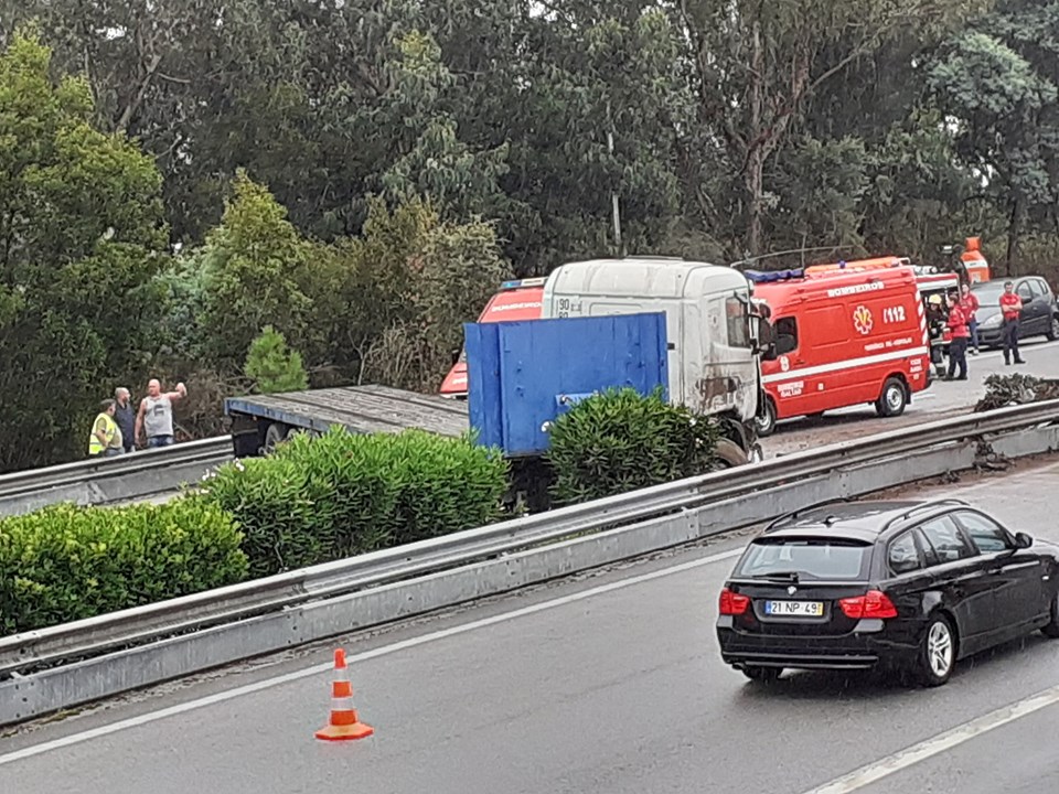 O pesado ficou atravessado na via após embater no separador central que acabou por destruir.